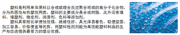 3、热学性能:熔点、氧化诱导时间、熔体流动速率、热变形温度、维卡软化温度、线膨胀系数、氧指数、热稳定性,软化点等。